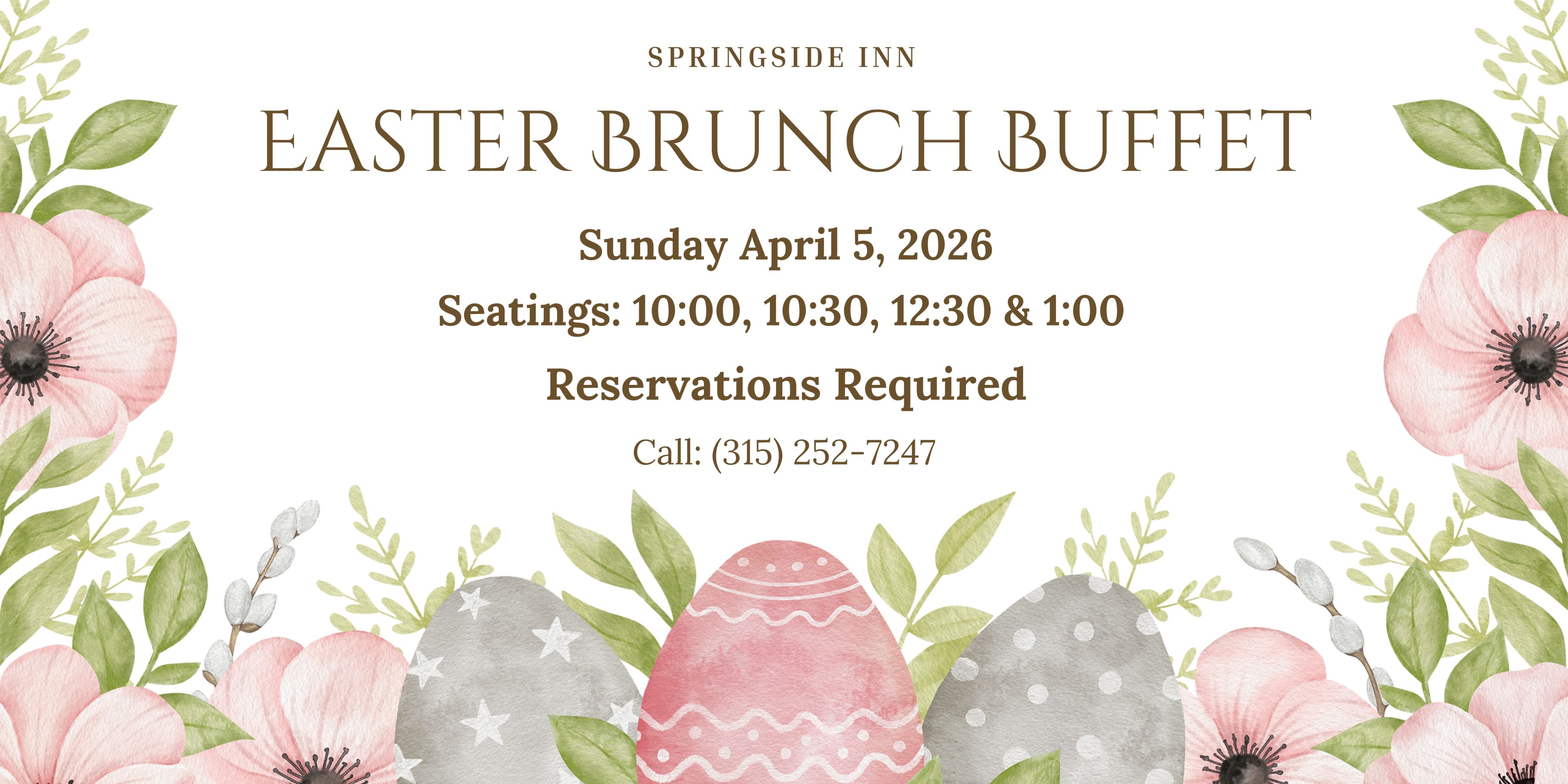 Springside Inn 6141 West Lake Rd, Auburn, New York, United StatesJoin us for our annual Easter Brunch Buffet. Enjoy this yearly tradition with delicious brunch favorites and Springside Inn's famous cheese souffle! Reservations Required: Seating Times are 10:00, 10:30, 12:30 …